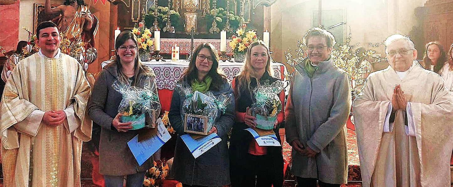 Für ihr langjähriges Engagement wurde ihnen herzlich von Diakon Andreas Wachter und Pfarrer i.R. Tadeusz Kmiec-Forstner gedankt: Theresa Forster und Verena Huber waren jeweils acht Jahre im Pfarrgemeinderat tätig und wechselten sich in der Aufgabe der Schriftführerin ab. Regina Hofmeister gehörte dem Gremium vier Jahre lang an. Das Bild oben zeigt von links: