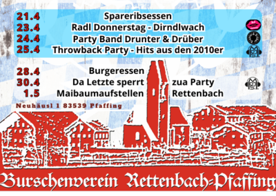 Hoaßt: Da Baam liegt jetzt wieder beim Maibaum-Stüberl in Neuhäusl. Äußerst gut gesichert, wie aus internen Kreisen verlautete. Und weiterhin ist tagtäglich was geboten. Ab 18 Uhr und siehe auch das Programm weiter unten im Text.