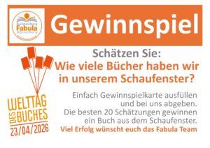 Auch in diesem Jahr gibt es, zu Ehren des Welttag des Buches am 23. April, ein Gewinnspiel in der Buchhandlung Fabula. Die Frage lautet, wie viele Bücher sind im Schaufenster?
