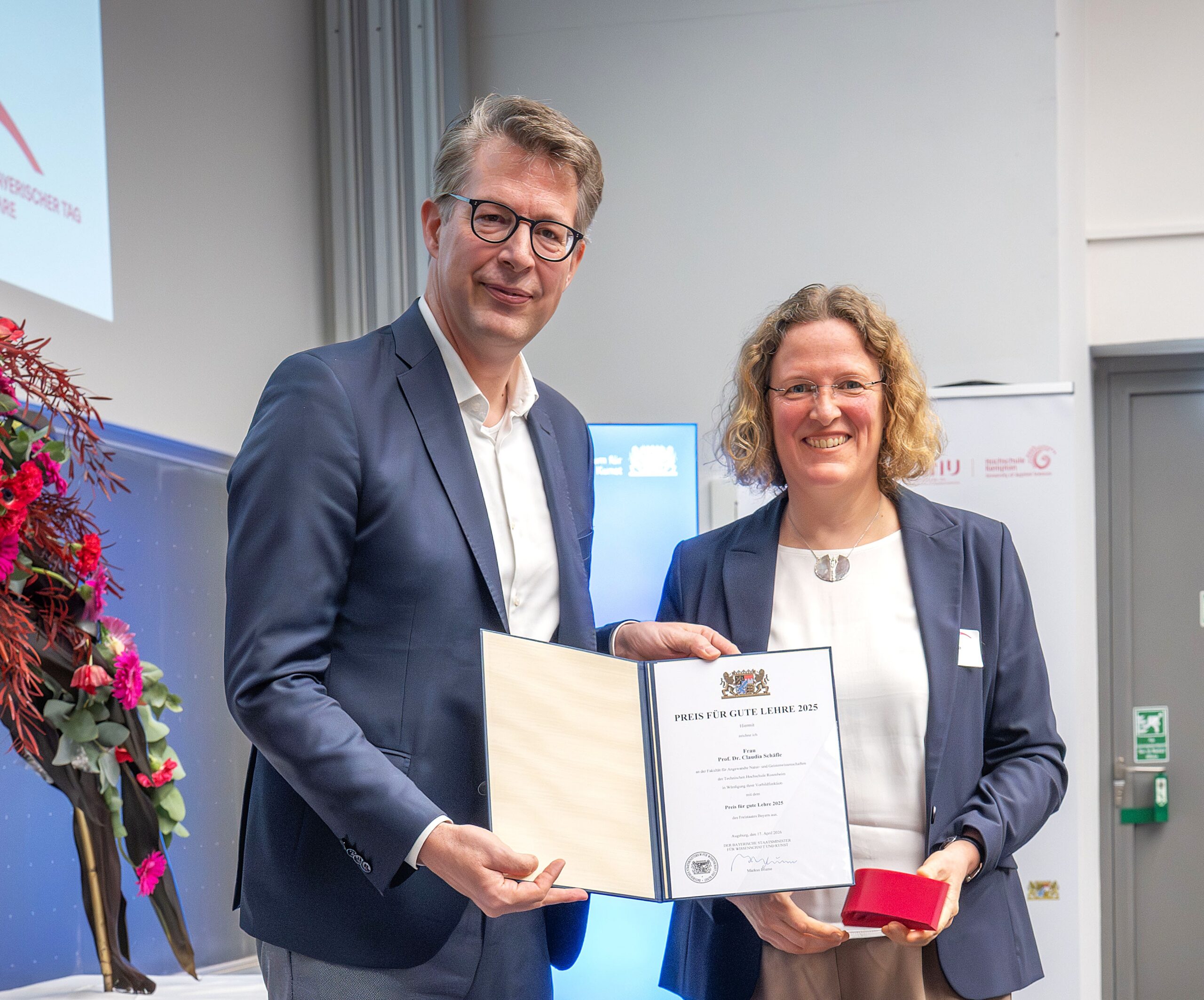 Große Anerkennung für exzellente Lehre an der Technischen Hochschule Rosenheim: Prof. Dr. Claudia Schäfle, Professorin an der Fakultät für Angewandte Natur- und Geisteswissenschaften, wurde mit dem „Preis für gute Lehre“ des Bayerischen Staatsministeriums für Wissenschaft und Kunst ausgezeichnet. Die Ehrung wurde im Rahmen des „Bayerischen Tags für gute Lehre“ in Augsburg verliehen.