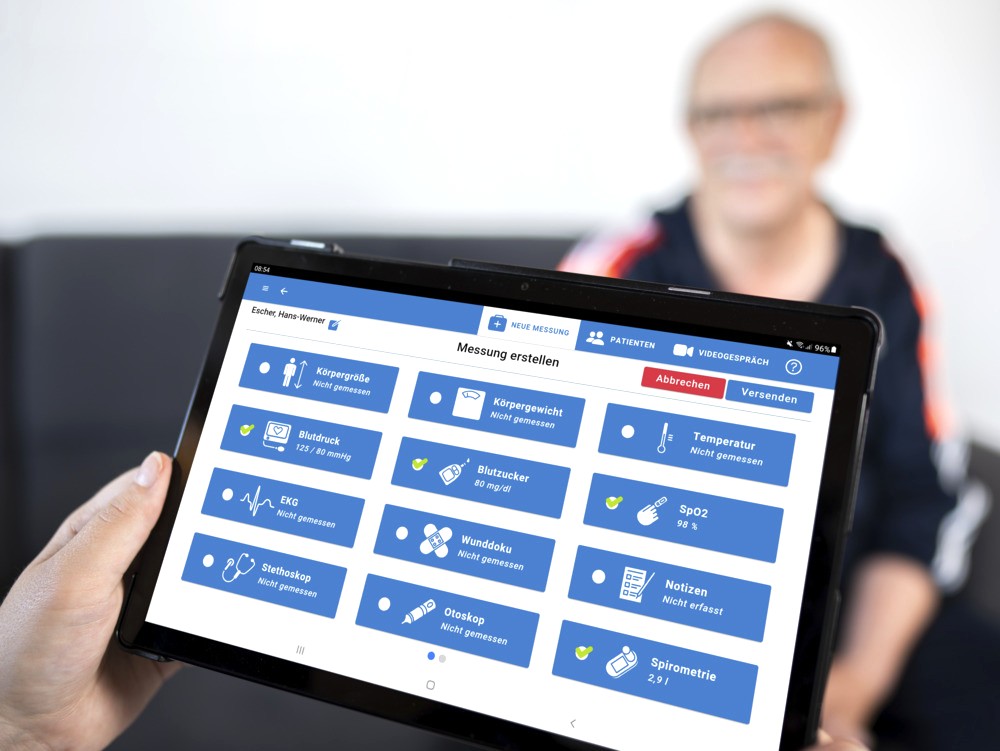 Mit dem mobilen Telemedizin-Kit können Pflegekräfte Vitaldaten direkt erfassen und in Echtzeit an den behandelnden Arzt übermitteln – für eine schnelle und gezielte medizinische Einschätzung vor Ort.