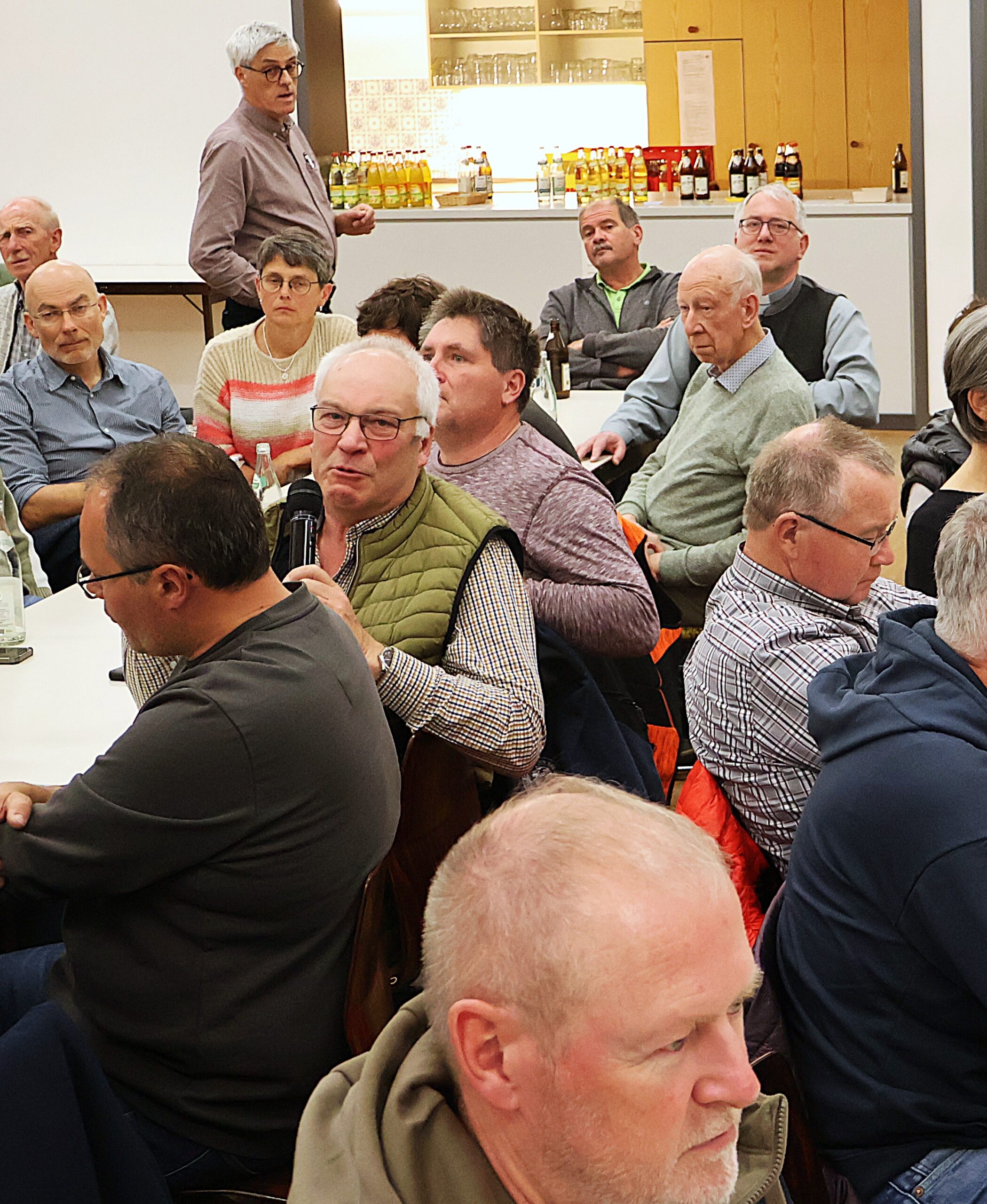 Absolut nicht zufrieden zeigte sich Sepp Hartl (im Bild unten vorne mit Mikro) mit der aktuellen Planung der neuen Straße beim neuen Nahversorger-Zentrum am Pfaffinger Ortsbeginn. Seiner Ansicht nach sei die Mehrbelastung durch ein höheres Verkehrsaufkommen – Schulbusse, An- und Abfahrer Einkaufen, Schule, Kindergarten – nicht wirklich berücksichtigt, nicht dargestellt. Das gehöre in den ersten Plan und nicht in den letzten, so seine Ansicht, als der Bürgermeister darauf hinwies, dass da schon eine leistungsfähige Straße gedacht sei, aber die Zeit habe gefehlt bislang zur konkreten Darstellung.