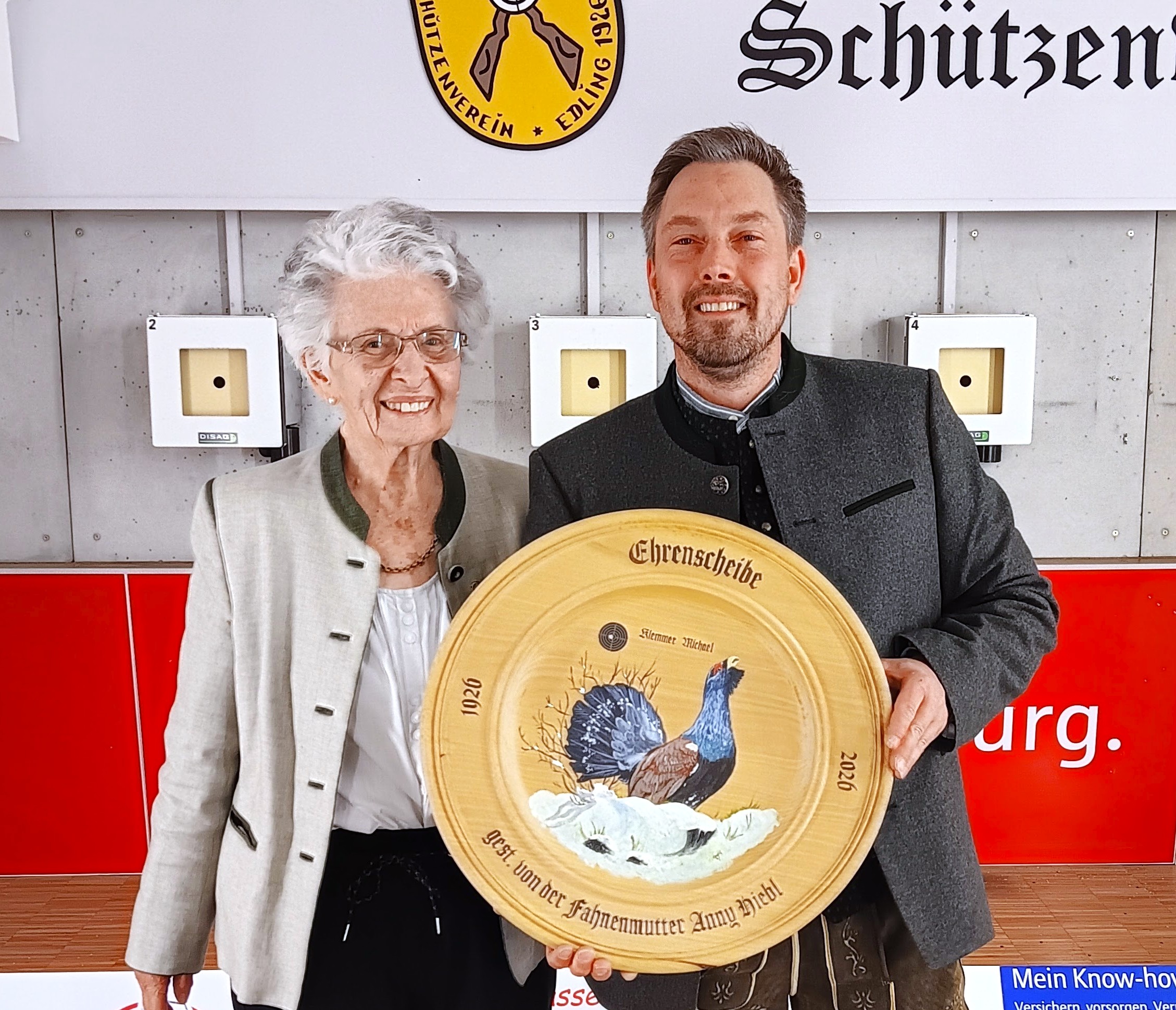 Anlässlich des Gründungs-Jubiläums stiftete die Fahnenmutter Anny Hiebl eine Scheibe, auf der mit einem alten Knicklaufgewehr geschossen wurde. Diese gewann mit dem besten Teiler Michael Klemmer.