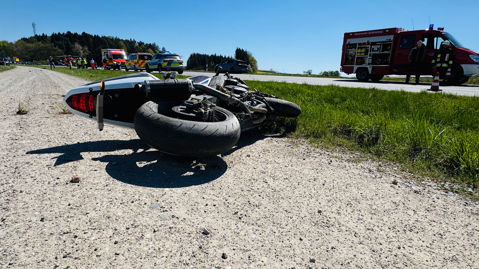 Alarm für die Feuerwehr Schönberg am Freitagnachmittag: Die Floriansjünger rückten gegen 13.45 Uhr auf die B304 beim Weiler Schilchau aus. Dort hat sich ein Verkehrsunfall mit einem Motorrad ereignet. Neben Rettungsdienst und Polizei ist auch Kreisbrandinspektor Stephan Hangl im Einsatz. Der Motorradfahrer wurde beim Unfall so erheblich verletzt, dass ein Rettungshubschrauber angefordert wurde.