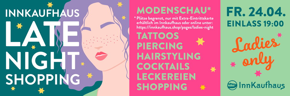 Nach dem riesigen Erfolg bei der letzten Ladies-Night ist es heute Abend um 19 wieder soweit: Das Innkaufhaus öffnet ausschließlich für weibliche Besucher seine Türen, um ihnen wieder einen entspannten Abend voller Shopping, Beauty und besonderer Erlebnisse zu bescheren. Im gesamten Haus bieten sich Inspirationen, attraktive Angebote und ausreichend Zeit, in Ruhe durch die verschiedenen Abteilungen zu stöbern.