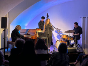 Die junge Münchner Jazz-Sängerin und Komponistin Fernanda von Sachsen präsentierte gemeinsam mit Pablo Struff (Piano), Sebastian Claas (Bass) und Jonas Sorgenfrei (Schlagzeug) ein facettenreiches Programm aus Eigenkompositionen und ausgewählten Jazz-Standards. Ihre Musik spannte einen eindrucksvollen Bogen zwischen lyrischer Tiefe, expressiver Harmonik und kantigen Rhythmen. Dabei verschmolzen Einflüsse aus dem klassischen Gesang mit der Tradition des Vocal Jazz zu einer unverwechselbaren Klangsprache.