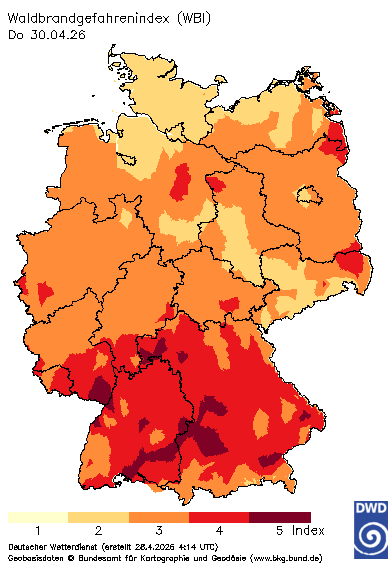 Bis Stufe fünf von fünf – das wird am kommenden Donnerstag zur Waldbrandgefahr für die Region Wasserburg – siehe Grafik – vorausgesagt vom Deutschen Wetterdienst. Seit Wochen ist es viel zu trocken. Deshalb der Appell, im Wald oder in einer Entfernung von weniger als 100 Metern davon