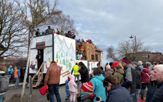 Viele Faschingswagen auf der Zugstrecke und zahlreiche Besucher am Straßenrand