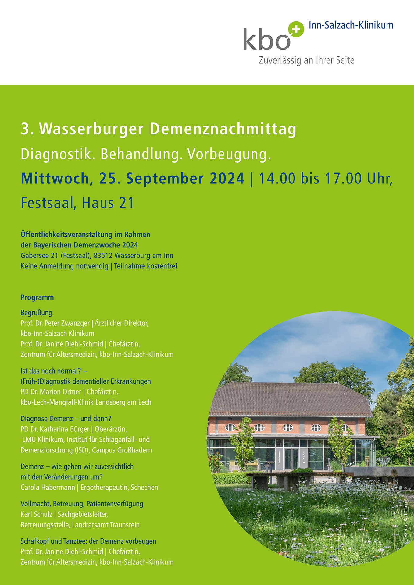 25Sep14:0017:003. Wasserburger Demenznachmittag - Diagnostik, Behandlung, VorbeugungInformationsveranstaltung im Rahmen der Bayerischen Demenzwoche 2024 - Inn-Salzach-Klinikums Wasserburg