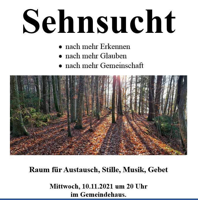 Suchen – aufbrechen – begegnen. So lautet das Thema am morgigen Mittwoch um 20 Uhr im evangelischen Gemeindehaus in Wasserburg. Ein Kreis für Menschen mit Sehnsucht nach mehr: Nach mehr Erkennen, nach mehr Glauben, nach mehr Gemeinschaft. Der Abend soll Raum geben für Austausch, Stille, Musik, Gebet …