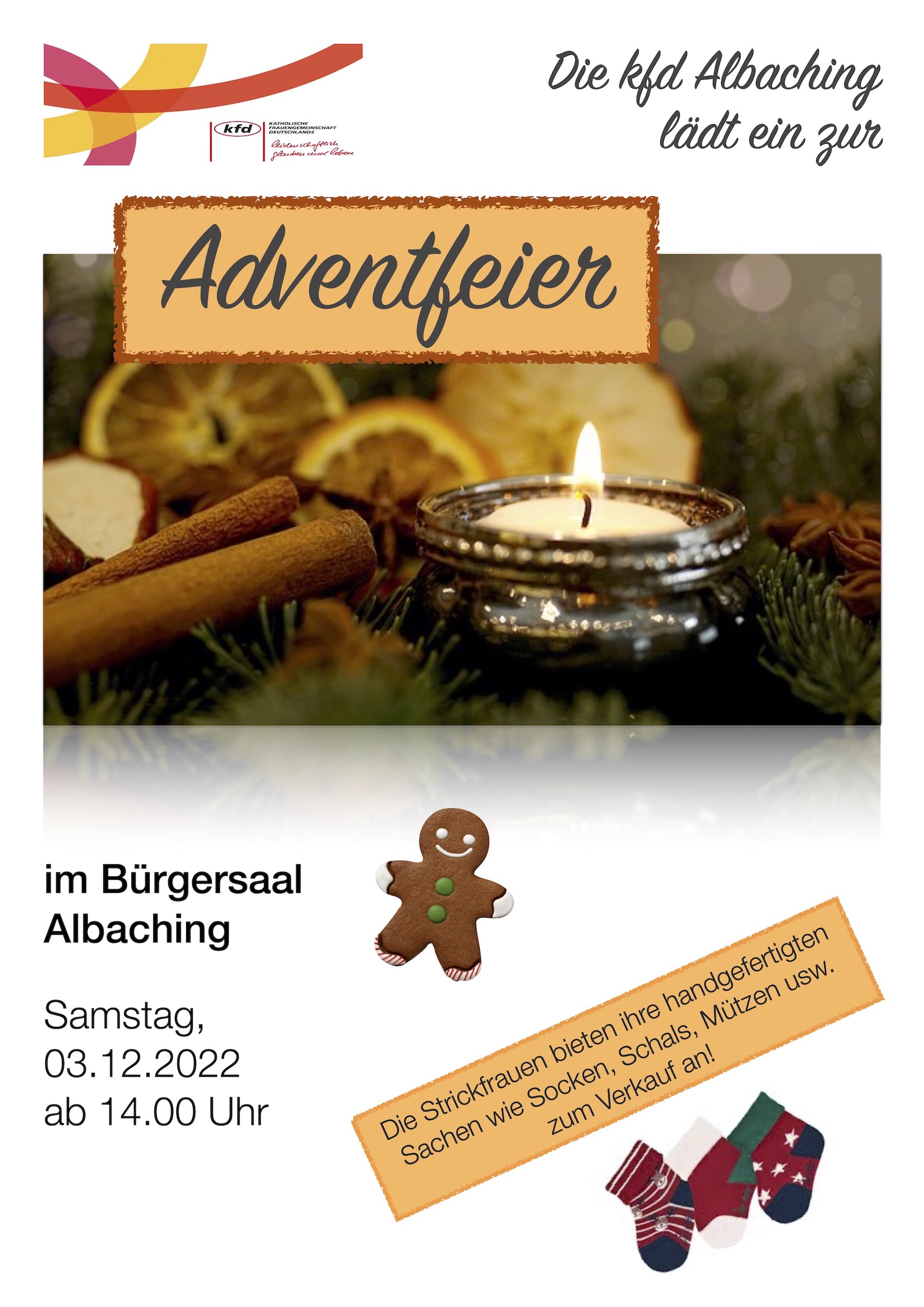 Die kfd (Katholische Frauengemeinschaft Deutschlands) Albaching veranstaltet am Samstag, 3. Dezember, ab 14 Uhr eine Adventfeier im Bürgersaal Albaching.