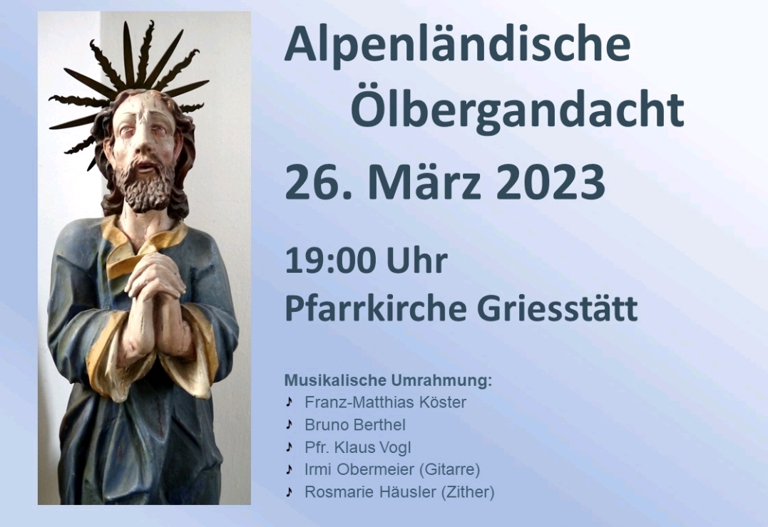 Am Sonntag, 26. März, um 19 Uhr findet in der Pfarrkirche Griesstätt eine alpenländische Ölbergandacht statt.