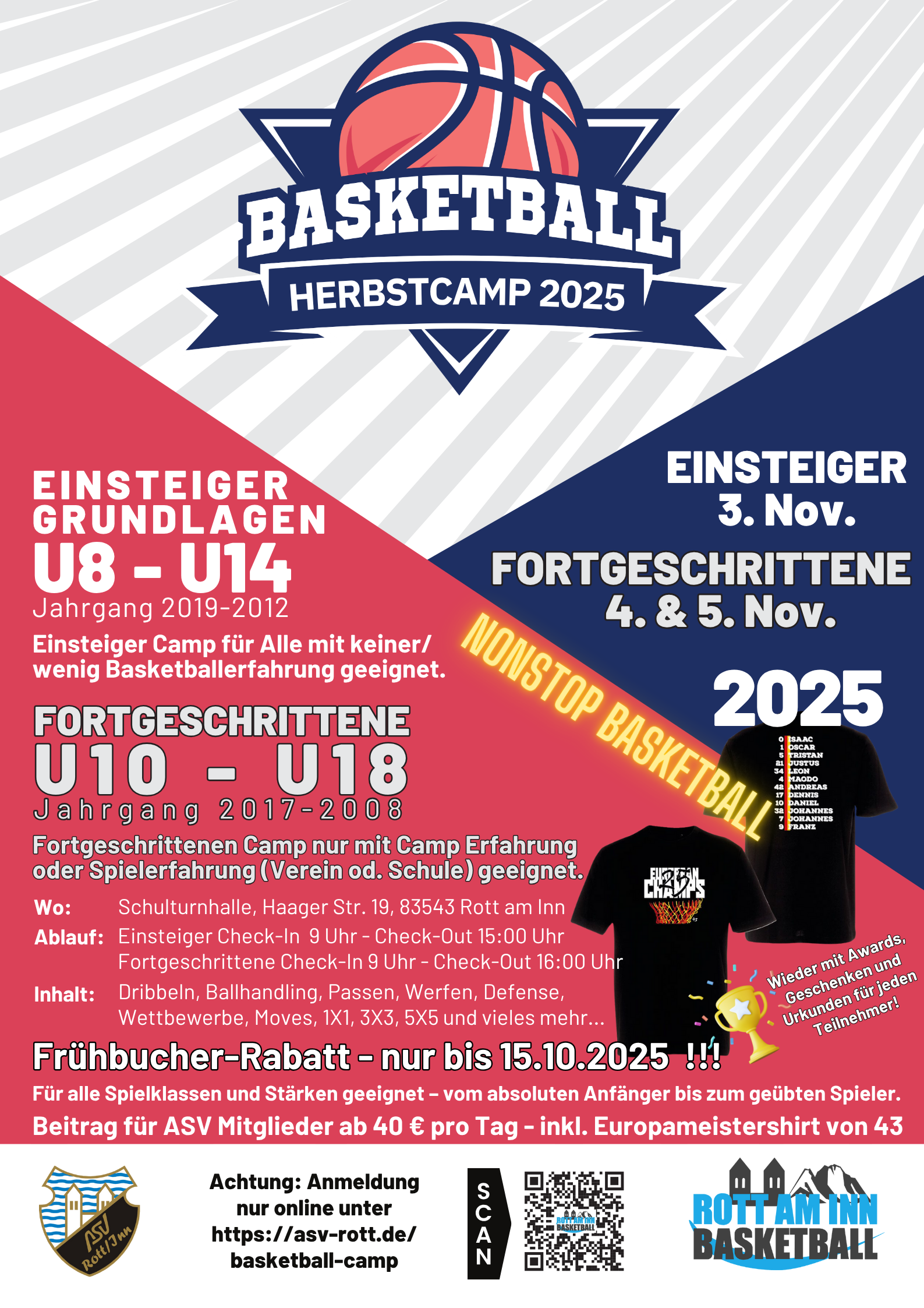 In den Herbsferien 2025 bietet der ASV Rott Basketball ein zweistufiges Herbstcamp in der Rotter Schulturnhalle an. Einsteiger ab können bereits am Montag den 03.11. die Basics erlernen und dann am darauffolgenden Di. 4.11. und Mi. 5.11. das erlernte weiter ausbauen.