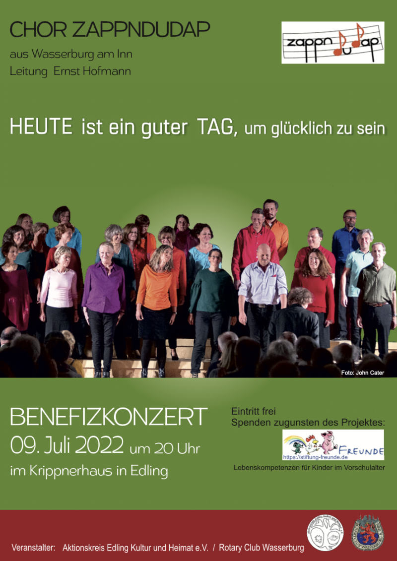 Der Wasserburger Chor „Zappndudap“ gibt am 9. Juli in Edling ein Benefizkonzert. Heiteres, Hintergründiges, Emotionales, Bekanntes – aber auch Unbekanntes, Oldies und eigene Songs in ganz neuen Arrangements, das ist der Kult-Chor „Zappndudap“ unter der Leitung von Ernst Hofmann. Das Konzert beginnt um 20 Uhr im Krippnerhaus. Der Eintritt ist frei, Spenden sind willkommen und gehen an die Stiftung „Freunde“