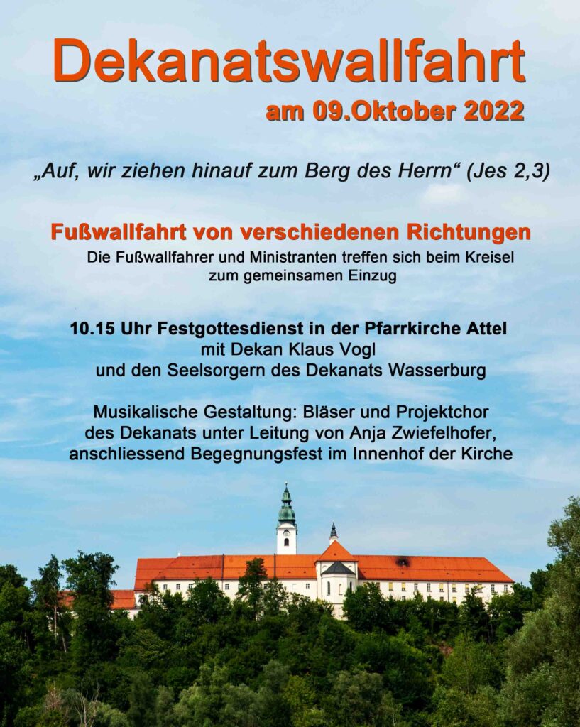 Die Dekanatswallfahrt sowie der Dekanats-Ministrantentag in Attel finden am Sonntag, 9. Oktober, statt. Die Fußwallfahrer und die Ministranten treffen sich um 10 Uhr am Kreisel, um gemeinsam einzuziehen. Für Familien mit Kindern ist ab 9.15 Uhr eine kleine Wallfahrt vom Parkplatz der Gärtnerei in Attel aus geplant.