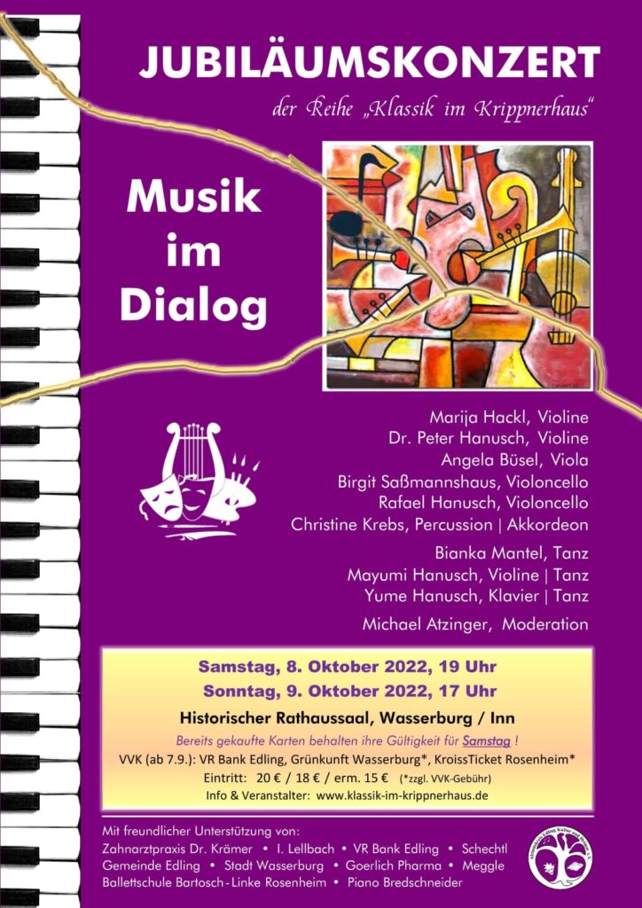„Was lange währt, wird endlich gut“ – so könnte man ausgerechnet das Jubiläumsprojekt der beliebten Edlinger Konzertreihe „Klassik im Krippnerhaus“ übertiteln: Ursprünglich für März 2019 geplant, musste es vor allem bedingt durch die Corona-Pandemie mehrfach verschoben werden. Die künstlerischen Leiter, Dr. Peter und Yume Hanusch, haben sich jedoch nicht entmutigen lassen und freuen sich nun sehr, das Vorhaben (im mittlerweile also fünften Anlauf) in Form von zwei abendfüllenden Veranstaltungen zur Aufführung zu bringen: „Musik im Dialog“. Am Samstag, 8. Oktober, um 19 Uhr und am Sonntag, 9. Oktober, 17 Uhr im Wasserburger Rathaussaal …