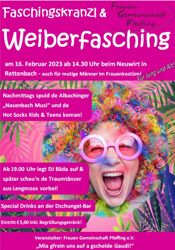 16Feb14:3023:00Faschingskranzl und WeiberfaschingFrauen-Gemeinschaft Pfaffing feiert beim Neuwirt in Rettenbach