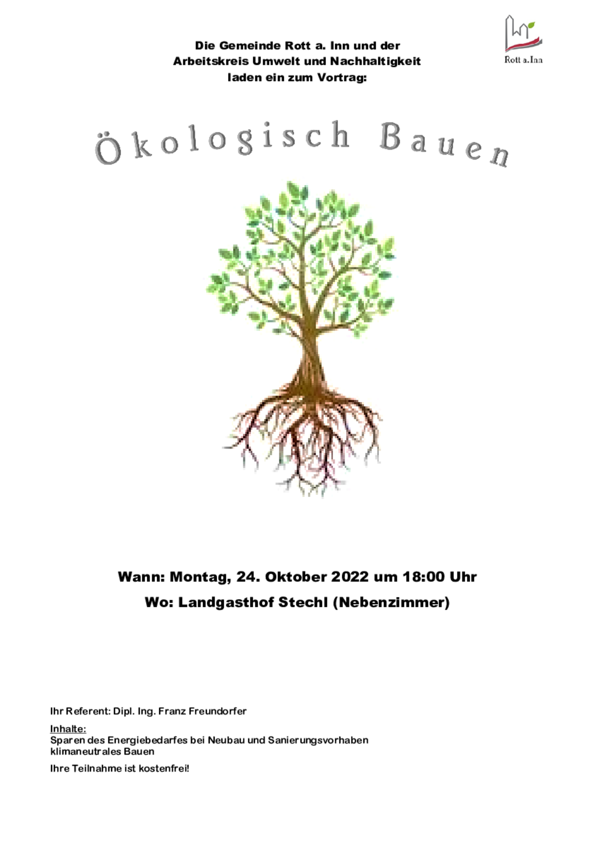 Die Gemeinde Rott und der Arbeitskreis Umwelt und Nachhaltigkeit laden am Montag, 24. Oktober um 18 Uhr in den Landgasthof Stechl ein – zu einem Vortrag mit Dipl. Ing. Franz Freundorfer: Ökologisch bauen …