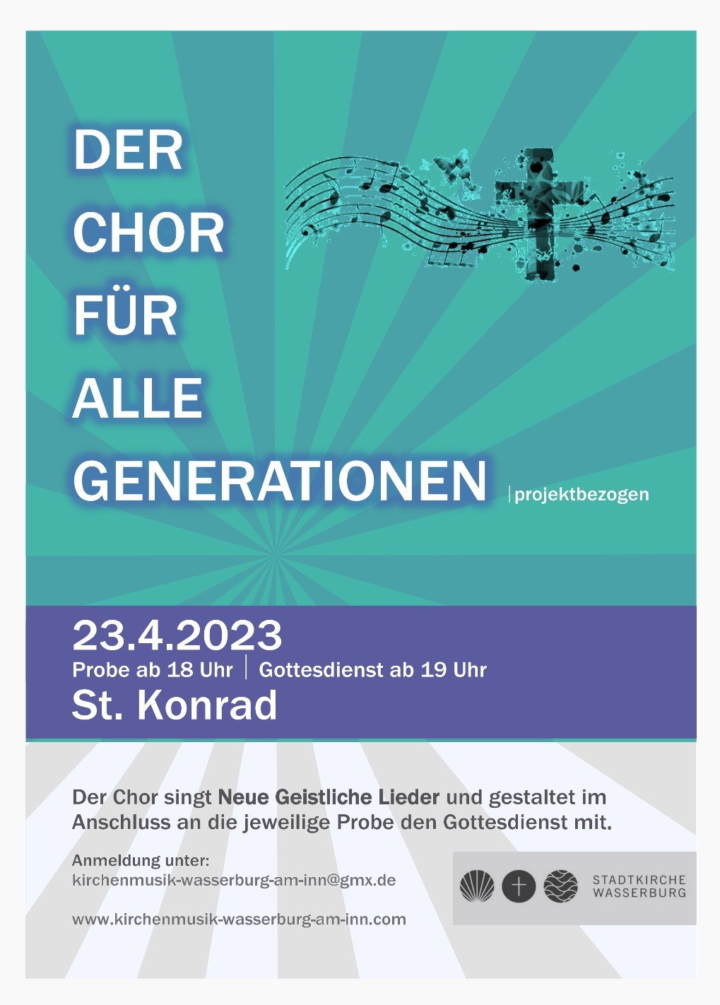 23Apr19:0020:00Gottesdienst mit dem CHOR FÜR ALLE GENERATIONENNeues Geistliches Lied in Wasserburg