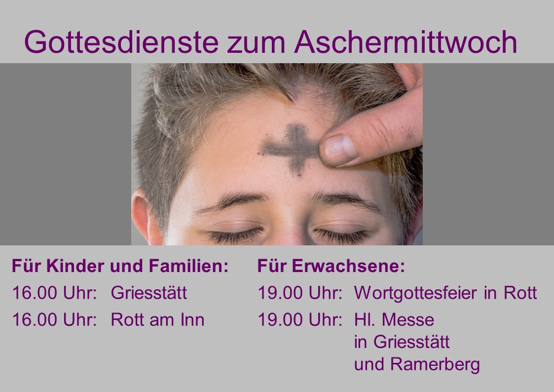 Am Aschermittwoch, 22. Febrruar, finden in der Griesstätter und Rotter Pfarrkirche jeweils um 16 Uhr Aschermittwochs-Feiern für Kinder und Familien statt. Abends um 19 Uhr ist in Rott zudem ein Wortgottesfeier mit Aschenauflegung, in Griesstätt und Ramerberg sind jeweils Heilige Messen, ebenfalls mit Aschenauflegung. Herzliche Einladung des Pfarrverbandes dazu