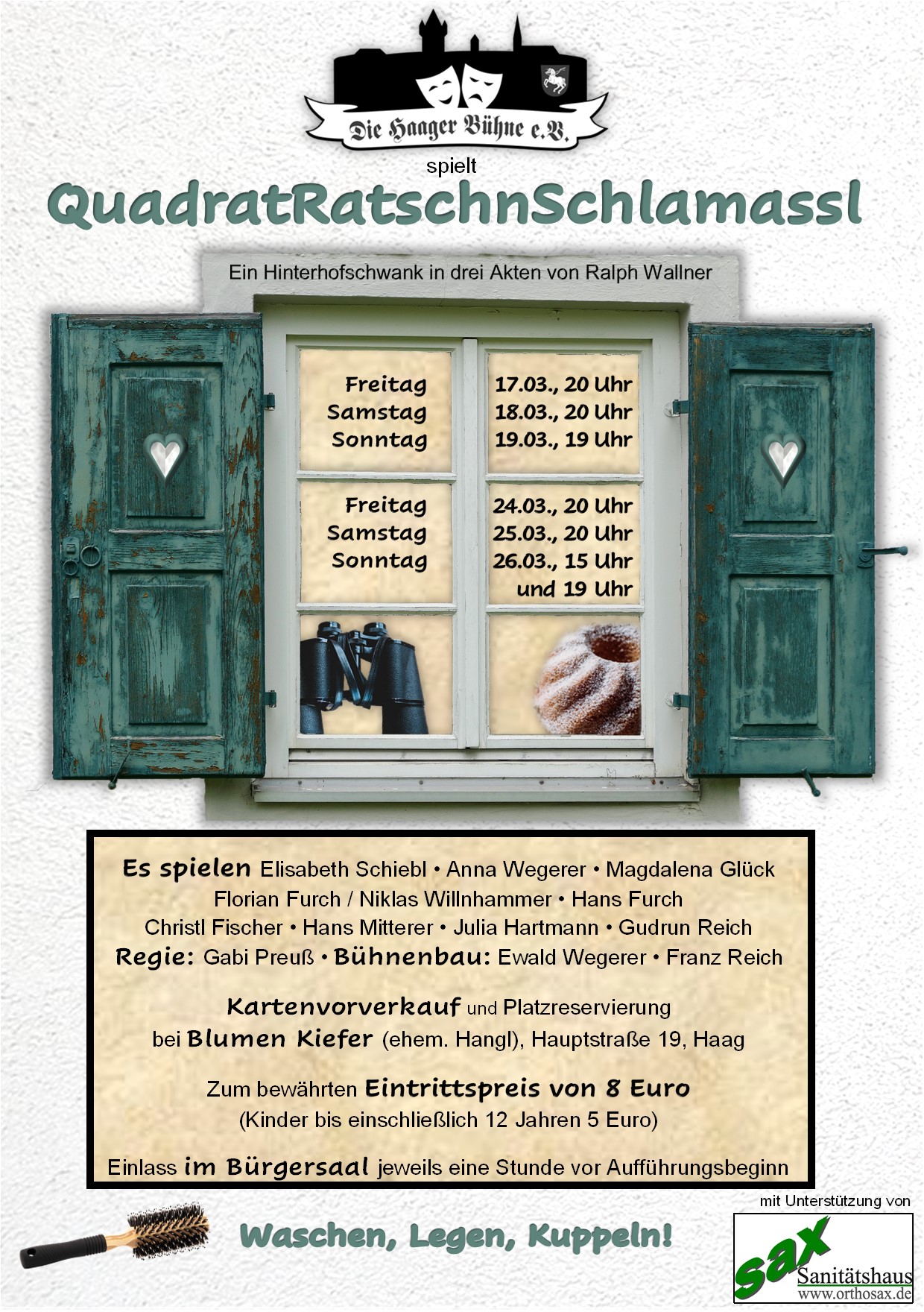 19Mär19:0022:00Haager Bühne: „QuadratRatschnSchlamassl“Einlass im Bürgersaal jeweils eine Stunde vor Aufführungsbeginn