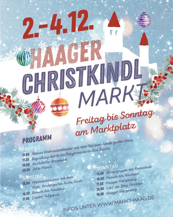 Am Sonntag tritt um 15 Uhr die Bläserklasse der Realschule auf, um 17.30 Uhr folgt der Haager Viergesang mit vorweihnachtlichen Liedern. Auch am Sonntag dürfen sich die kleinen Besucher vor dem Rathaus von 16 bis 17 Uhr Geschenke beim Nikolaus abholen. Gegen 18 Uhr erwartet die Besucher eine Begegnung mit den Stoa-Perchten aus Waging, welche über den Marktplatz streifen und mit ihren gruseligen Masken und lauten Schellen die Wintergeister vertreiben.