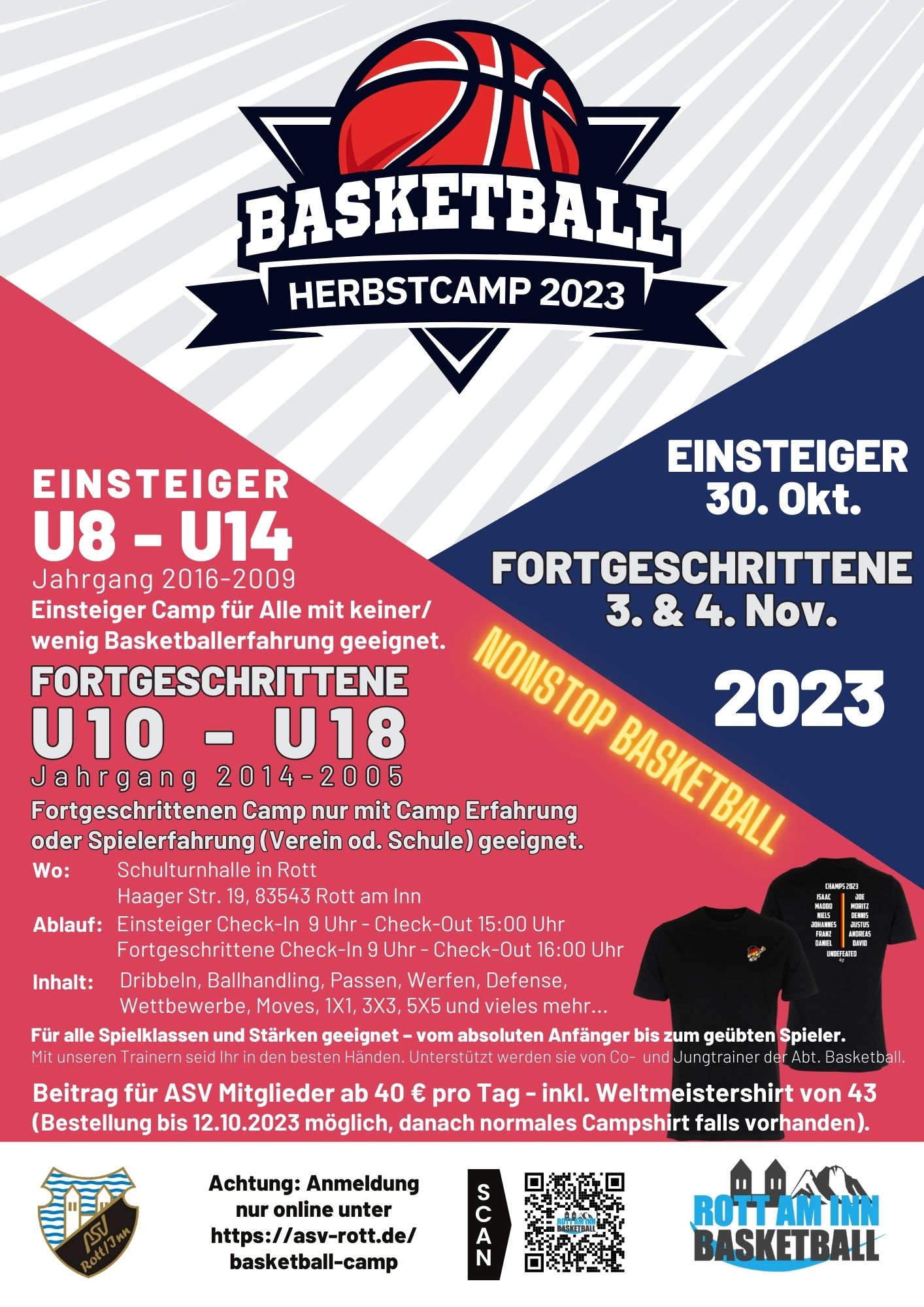 In den Herbsferien 2023 bietet der ASV Rott Basketball ein zweistufiges Herbscamp in der Rotter Schulturnhalle an. Einsteiger können bereits am Montag den 30.10. die Basics erlernen und dann am darauffolgenden Fr. 4.10. und Sa. 5.10. das Erlernte weiter ausbauen.