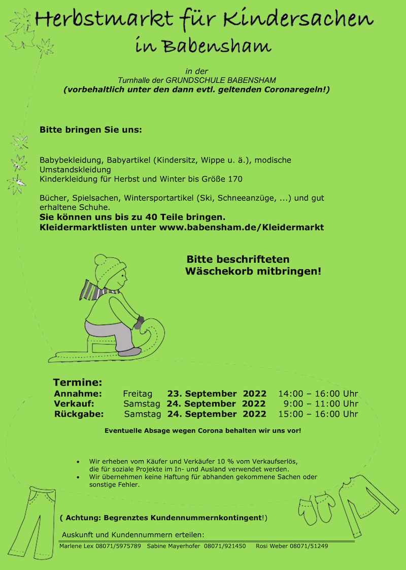 In der Turnhalle der Grundschule Babensham findet am 24. September wieder ein Herbstmarkt für Kinderkleidung statt. Angenommen und angeboten werden Babybekleidung, Babyartikel (Kindersitz, Wippe), modische Umstandskleidung, Kinderkleidung für Herbst und Winter bis Größe 170, Bücher, Spielsachen, Wintersportartikel (Ski, Schneeanzüge) und gut erhaltene Schuhe. Jeder Teilnehmer kann bis zu 40 Teile bringen.