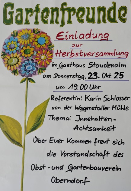 Die Vorstandschaft der Oberndorfer Gartler lädt am Donnerstag, 23. Oktober, um 19 Uhr im Gasthaus Staudenalm zur Herbstversammlung ein. Referentin ist Karin Schlosser von der Wagenstaller Mühle, die zum Thema „Innehalten – Achtsamkeit“ spricht.