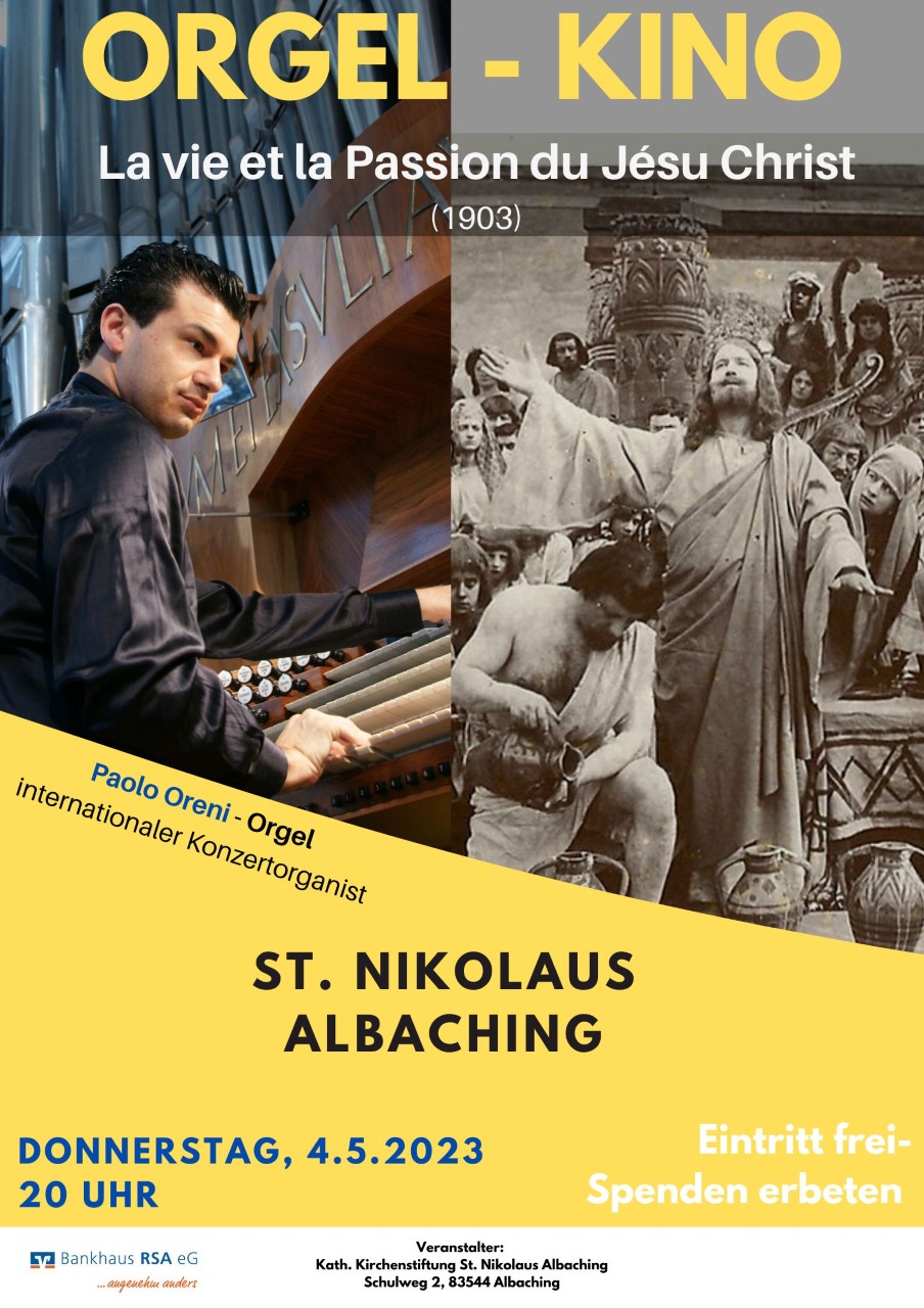 Auf ein absolutes Kultur-Highlight wird sich in Albaching gefreut: Kurzfristig hat sich für Donnerstag, 4. Mai, Paolo Oreni, ein international bekannter, italienischer Konzertorganist für ein Gastspiel in der Albachinger Pfarrkirche angesagt. Aufgeführt wird per Beamer und Leinwand dazu der Stummfilmklassiker La vie e la passion du Jésu Christ (Das Leben und das Leiden Jesu Christi) von 1903, zu dem Oreni live die Filmmusik auf der Orgel improvisieren wird.