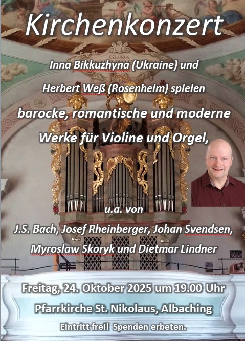 Konzertorganist Herbert Weß (Rosenheim) und Geigerin Inna Bikkuzhyna (Ukraine) spielen ein feierliches Programm für Violine und Orgel mit barocken, romantischen und modernen Werken, unter anderem von Johann Sebastian Bach, Josef Rheinberger und Johan Svendsen.