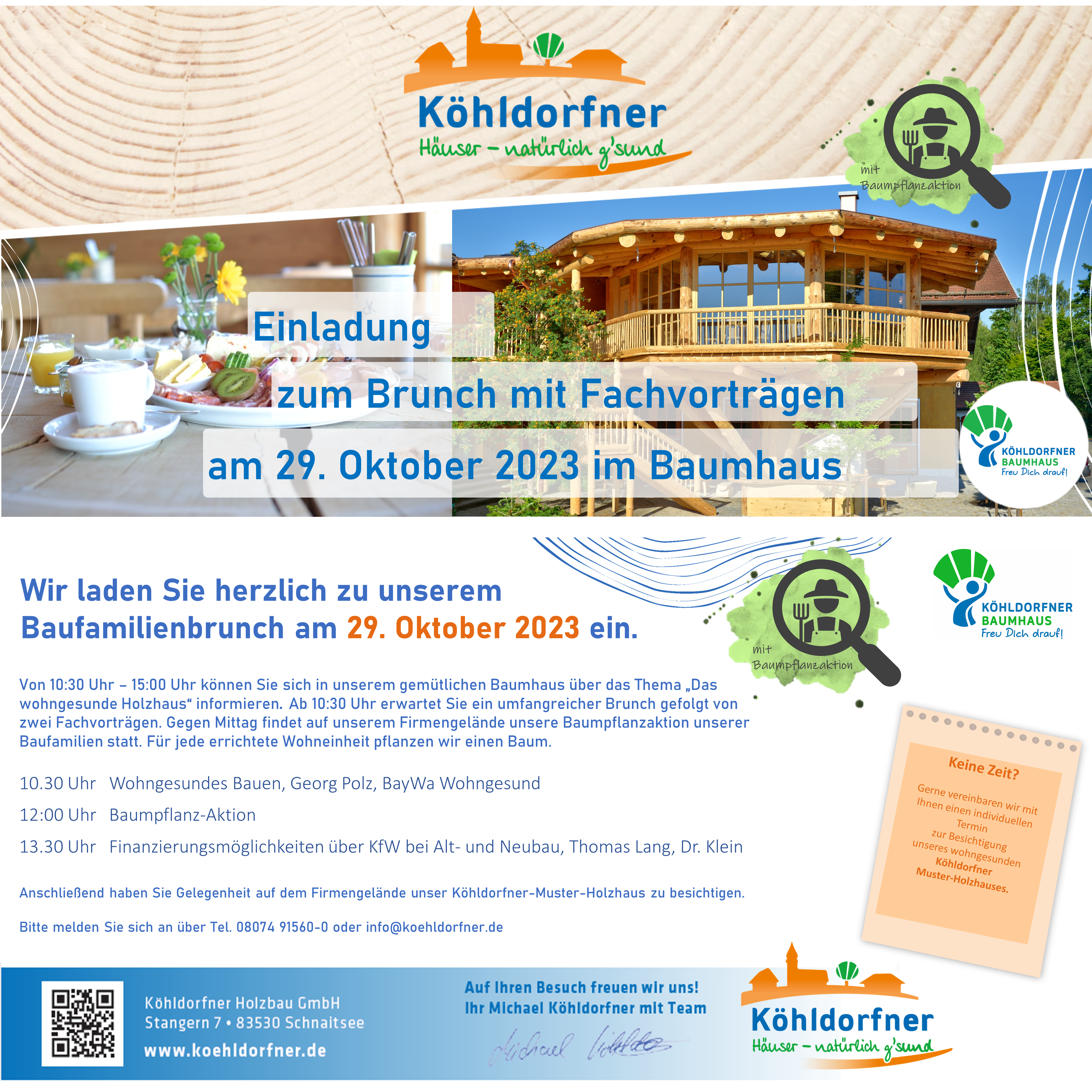 Am Sonntag, den 29. Oktober 2023 findet für Bauinteressierte von 10:00 – 15:00 Uhr wieder ein Baufamilienbrunch statt zum Thema “Das wohngesunde Holzhaus“ in unserem gemütlichen Köhldorfner Baumhaus auf dem Betriebsgelände in Stangern 7, 83530 Schnaitsee.