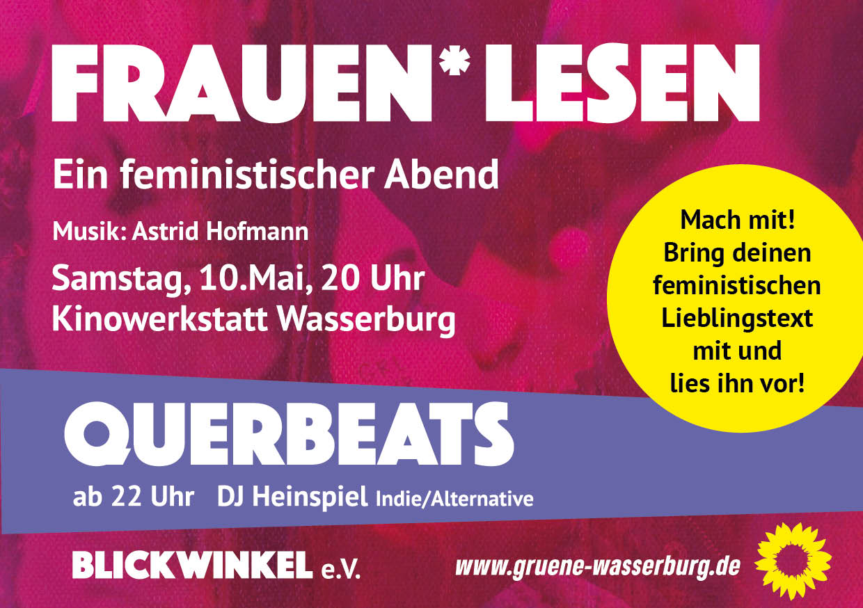 Der Verein Blickwinkel und die Wasserburger Grünen laden am Samstag, 10. Mai, ab 20 Uhr zum feministischen Abend unter dem Motto „Frauen lesen“ in die Wasserburger Kinowerkstatt ein. Menschen aller Geschlechter sind willkommen, denn Frauenrechte können nur gestärkt werden, wenn alle unterstützen.