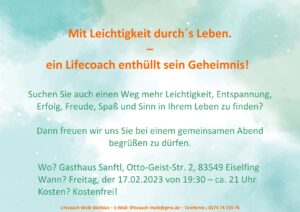 17Feb19:3021:00„Mit Leichtigkeit durchs Leben"Life-Coach Maik Mathias im Gasthaus Sanftl in Eiselfing - Eintritt frei