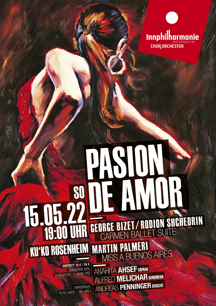 „Tango ist eine Therapie, welche die Seele befreit“, so der argentinische Tangolehrer Ricardo Vidort. Angesichts der schweren Zeiten, die gerade durchlebt werden, dürfte viel eine tiefe Sehnsucht nach solcher Befreiung erfüllen. Umso mehr freuen sich die Musizierenden der Innphilharmonie Rosenheim, endlich wieder gemeinsam konzertieren und unter dem Motto „Pasion de Amor“ zu einem tänzerischen, die Seele befreienden Programm voller Schwung und Leidenschaft einladen zu dürfen.