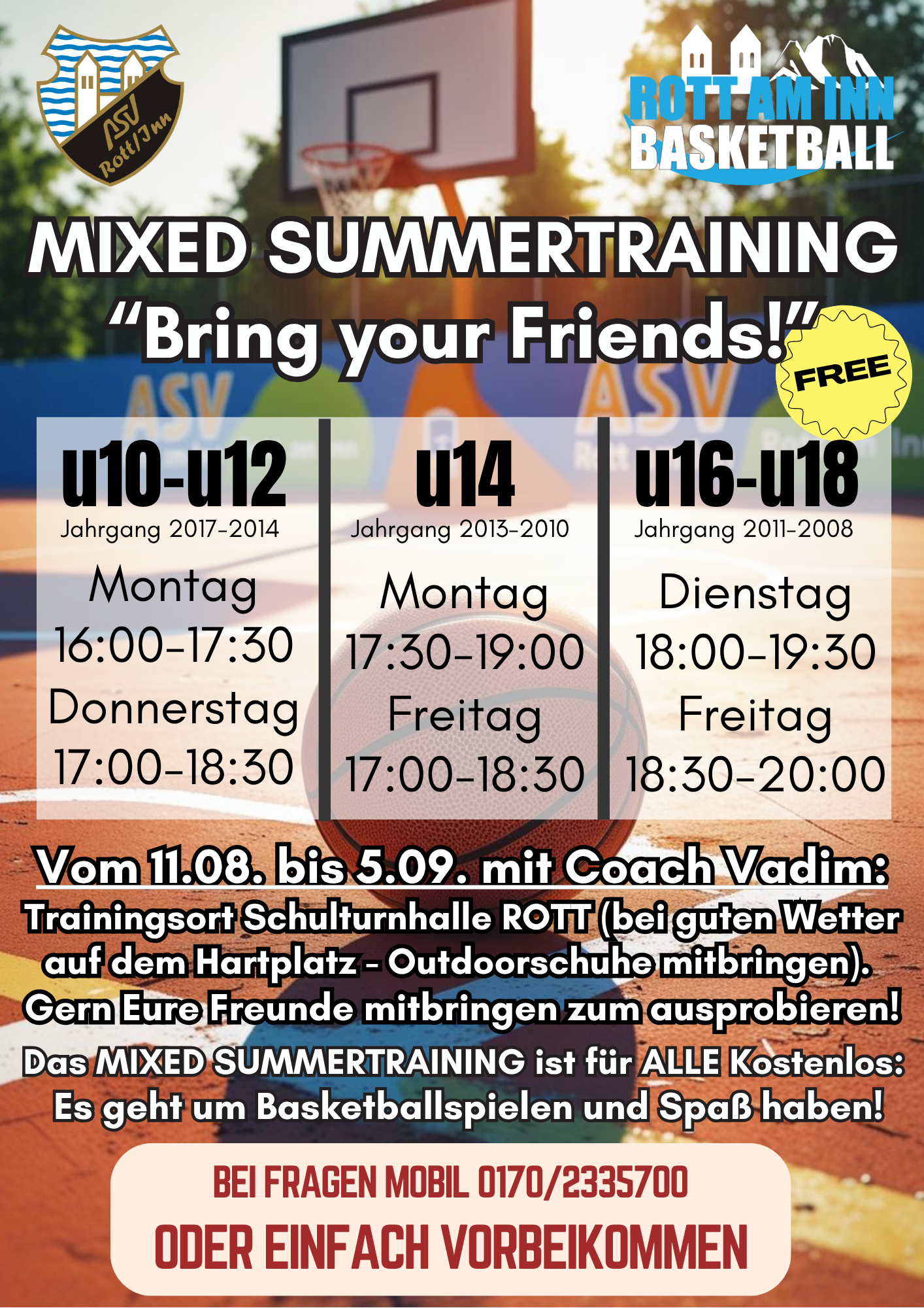 Der ASV Rott am Inn lädt alle Basketballbegeisterten (und solche die es werden wollen) herzlich zum „Mixed Summer Training“ ein, das vom 11. August bis zum 5. September stattfindet. Das Training wird von Coach Vadim Tiselsky geleitet und bietet eine tolle Gelegenheit, Basketball zu spielen, Spaß zu haben und neue Freunde zu treffen.