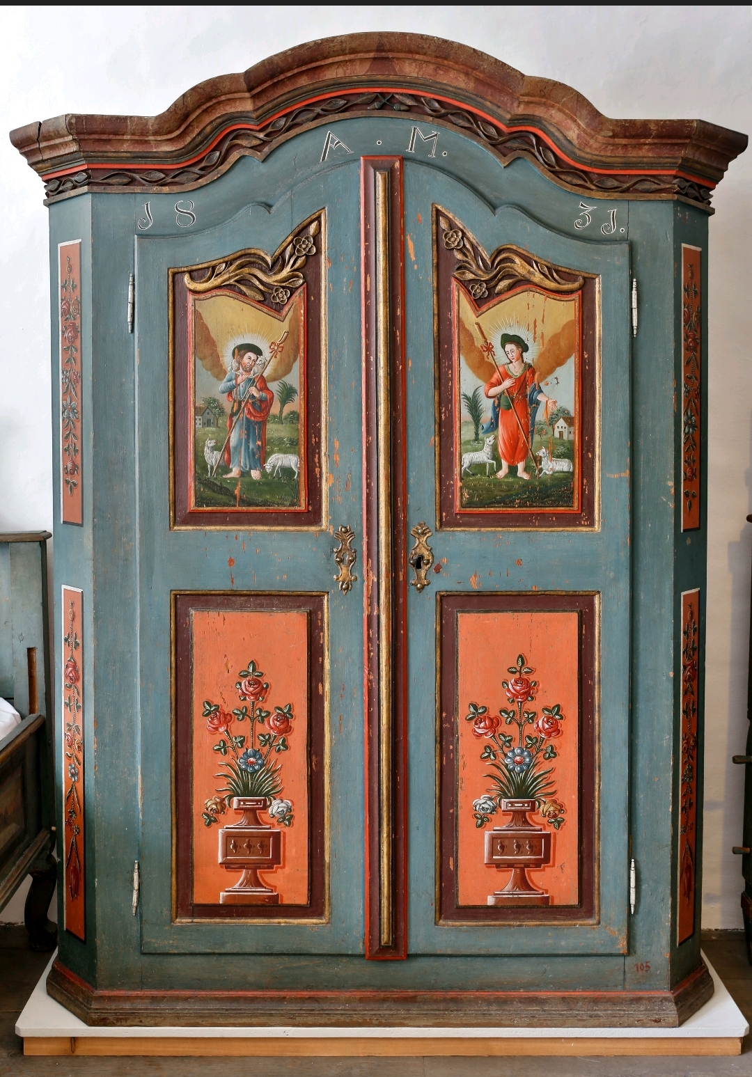 Die reich bemalten Möbelstücke des Bauernbarocks sind ein buntes Bilderbuch der oberbayerischen Kulturgeschichte und so klärt die Führung über die Bedeutung der zahlreichen Bilder und Symbole auf.