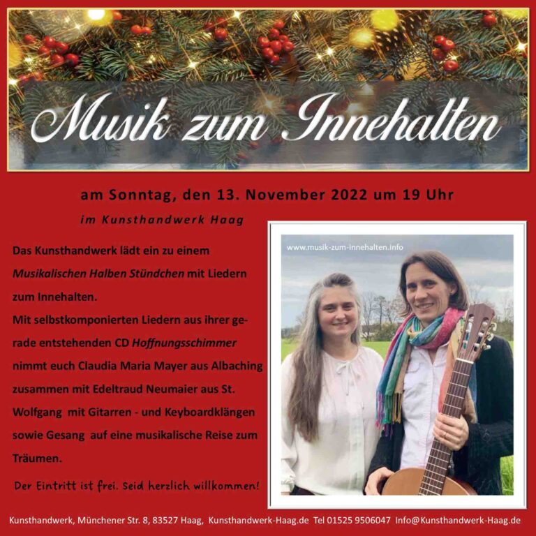 Musik zum Innehalten: Claudia Maria Mayer aus Albaching und Edeltraud Neumaier aus St. Wolfgang spielen am Sonntag-Abend, 13. November, um 19 Uhr im Kunsthandwerk in Haag, Münchner Straße 8.