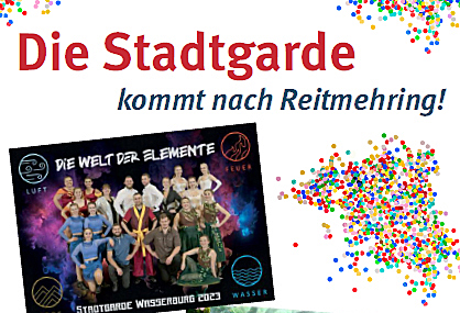 Ein närrisches Highlight für Reitmehring: Auf Einladung der Stadt Wasserburg und der Feuerwehr Attel-Reitmehring wird die Stadtgarde ihr aktuelles Programm „Die Welt der Elemente“ vorführen. Am Sonntag, 12. Februar, um 15 Uhr beim Feuerwehrhaus.