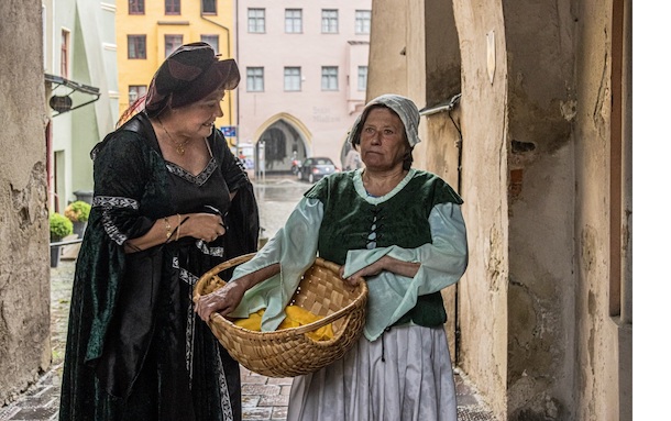 Hingehört mit der Edeldame Michaela und der Magd Resi (natürlich in historischer Gewandung)! Die beiden führen die Teilnehmer einer offenen Führung nicht nur in die bayrische Sprache ein (woher kommt beispielsweise das Diredari?), sondern führen auch einen heiteren Ratsch über historische Persönlichkeiten der Stadt Wasserburg. Dass dabei auch ein bisschen gelästert wird, versteht sich von selbst.