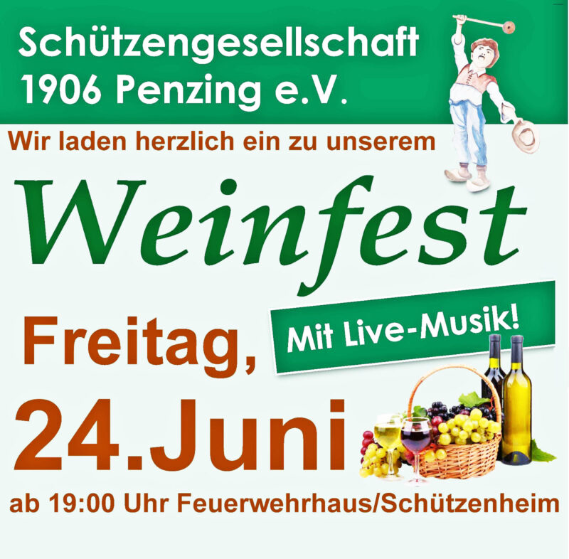 Die Penzinger Schützen laden am Freitag, 24.06.2022 zu ihrem Weinfest beim Feuerwehrhaus in Penzing ein. Los geht’s um 19 Uhr. Neben ausgewählten Weinen werden auch Brotzeitteller serviert. Für die musikalische Umrahmung und gute Stimmung sorgen “In oana Dur“.
