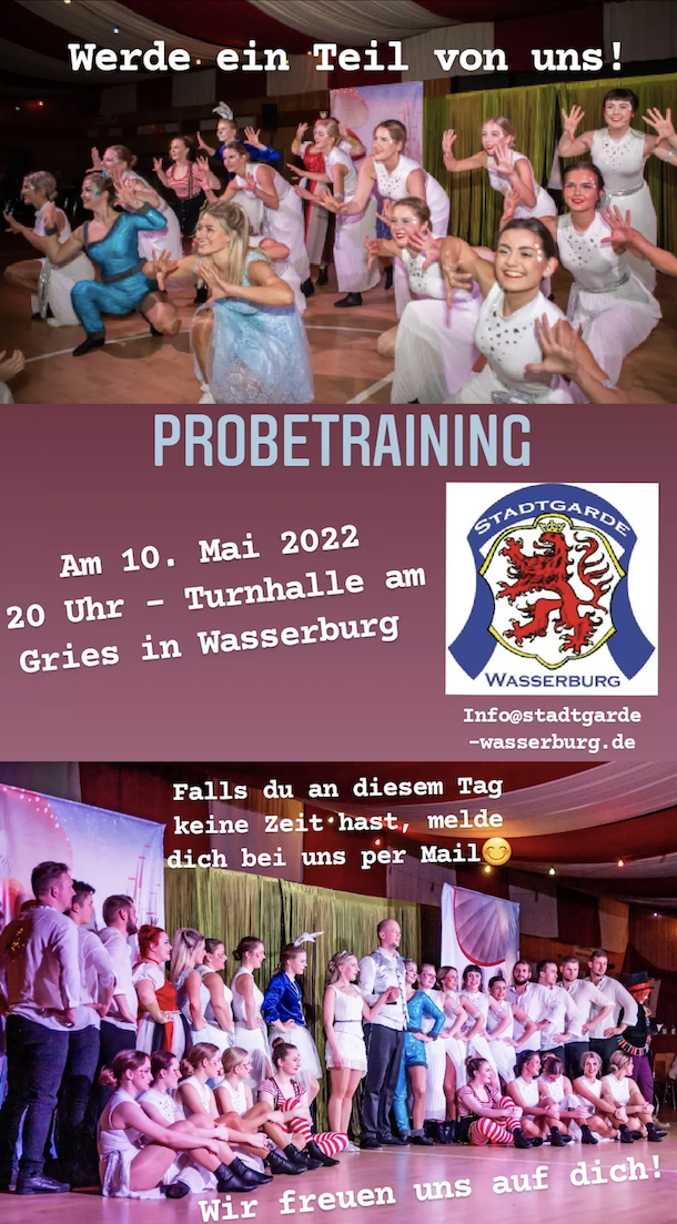 10Mai20:00Probetraining der Stadtgarde WasserburgDie Stadtgarde Wasserburg veranstaltet nächsten Dienstag, 10. Mai, um 20 Uhr in der Turnhalle am Gries ein Probetraining.