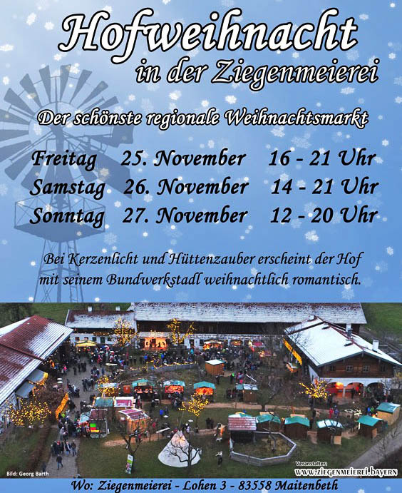 Romantische Hofweihnacht findet am ersten Advent-Wochenende – 25. bis 27. November – wieder auf dem Dreiseit-Hof der Ziegenmeierei Oberlohe statt. Zwischen Maitenbeth und Albaching gelegen.
