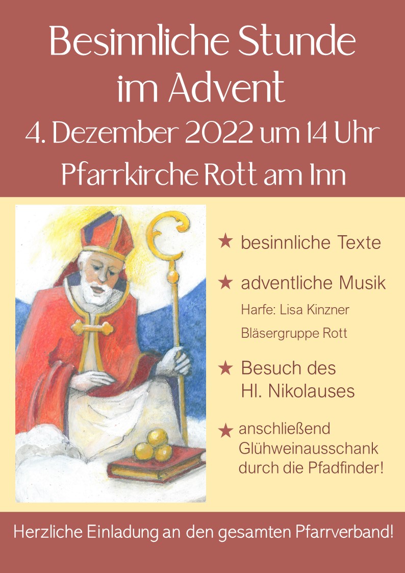 Die Rotter Pfarrei lädt zu einer „besinnlichen Stunde im Advent“ – und zwar am Sonntag, 4. Dezember, um 14 Uhr in der Rotter Pfarrkirche. Musikalisch wirken mit: Lisa Kinzner an der Harfe sowie die Rotter Bläser.