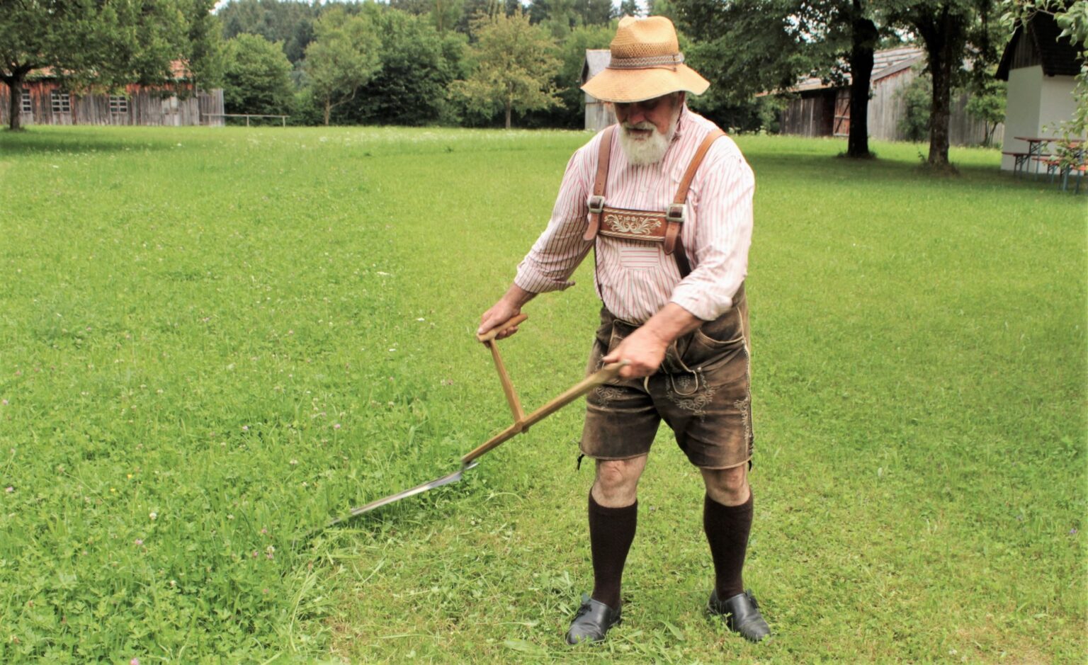 Der richtige Umgang und eine fachmännische Pflege des Geräts bilden die Grundvoraussetzungen einer erfolgreichen Arbeit. Richard Bals aus Waldhausen schult in Werkzeugkunde und weist in die Kunst des Dengels ein.