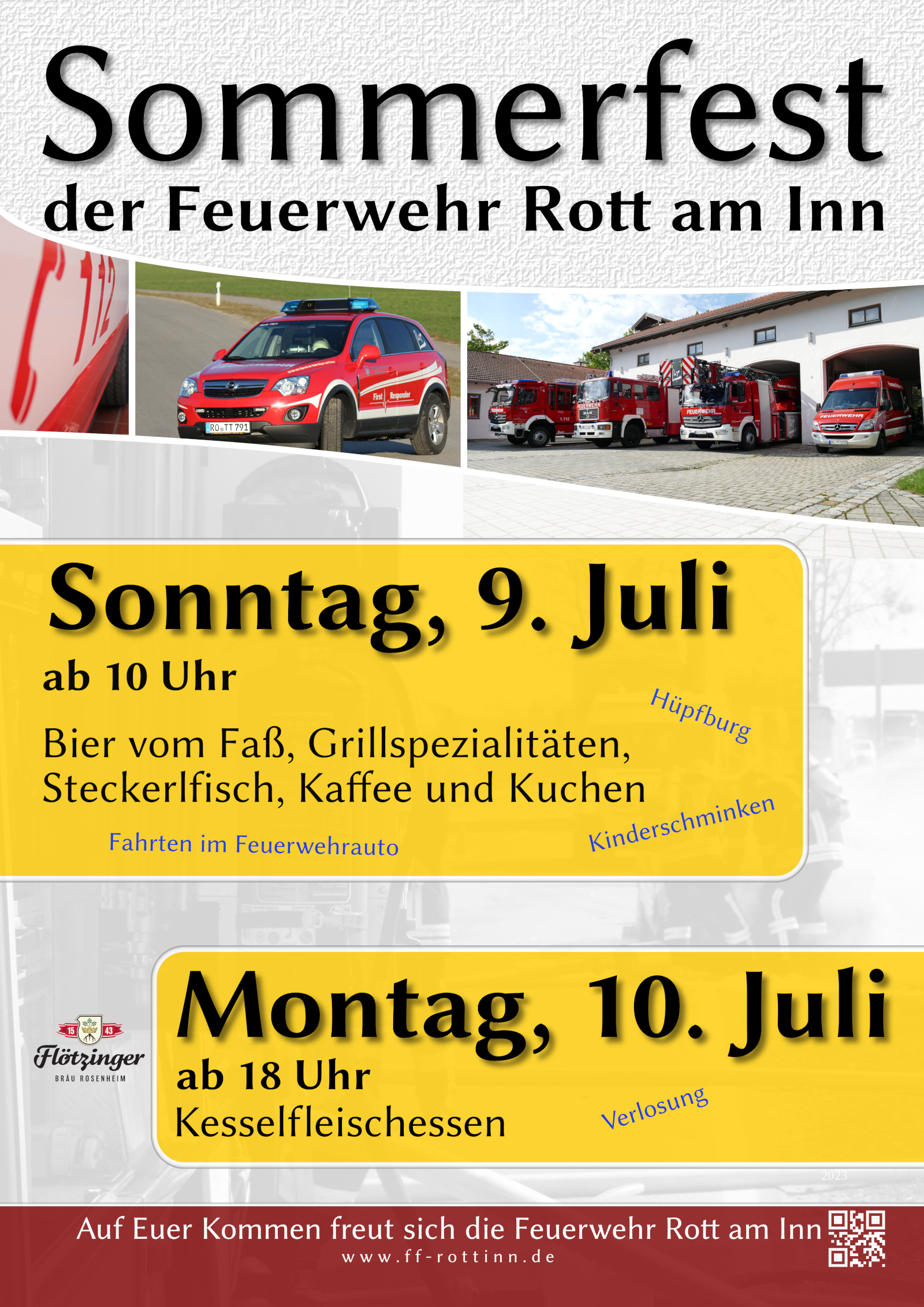Nach längerer Pause veranstalten wir endlich wieder am 9. und 10. Juli unser Sommerfest am Feuerwehrhaus. Es gibt wie gewohnt Grillspezialitäten, Steckerlfisch, Kaffee und Kuchen sowie zum ersten Mal Getränke aus dem Hause Flötzinger Bräu Rosenheim. Für die Kinder gibt es eine Hüpfburg, Kinderschminken und spannende Fahrten im Feuerwehrfahrzeug. Am Montagabend laden wir ein zum Kesselfleischessen. Hier gibt es wieder eine Verlosung mit tollen Preisen. Vorbeischauen lohnt sich!