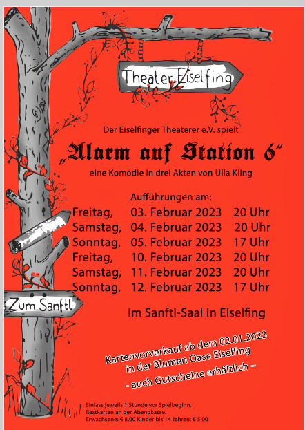 Der Vorverkauf für die insgesamt sechs Aufführungen am ersten und zweiten Februar-Wochenende im Gasthaus Sanftl ist in der Blumenoase Eiselfing.