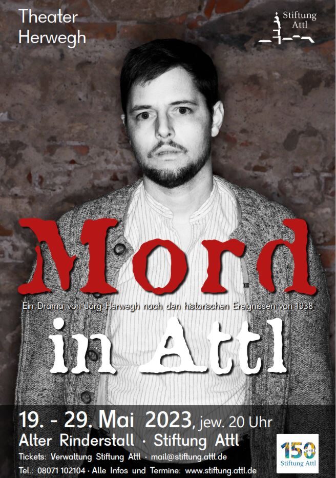 Ein historischer Stoff diente Jörg Herwegh als Grundlage für sein neues Drama „Mord in Attl“, das er mit seinem Ensemble an sieben Terminen von 19. bis 29. Mai in Attel aufführen wird. Tickets gibt es bereits ab sofort in der Verwaltung der Stiftung Attl  – Telefon; 08071 / 102104, E-Mail: mail@stiftung.attl.de – und dann Restkarten stets an der Abendkasse.