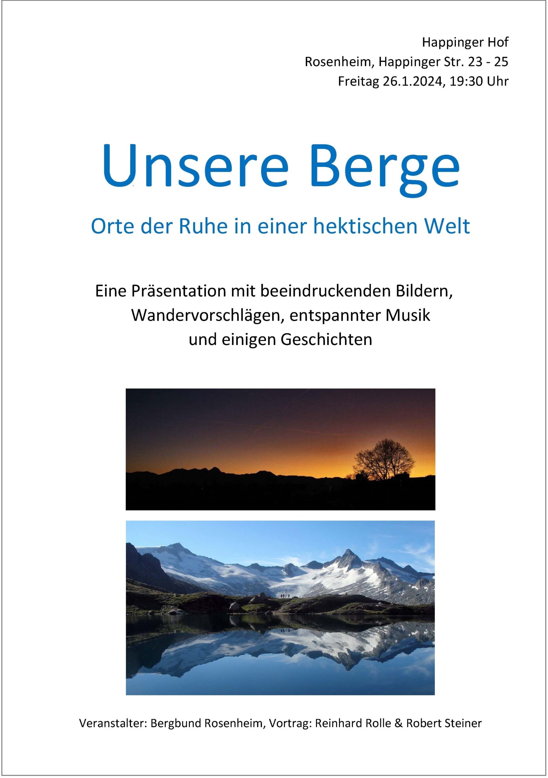 Mit der Darbietung Unsere Berge – Orte der Ruhe in einer hektischen Welt zeigt Reinhard Rolle eine geschickte Mischung aus Präsentation und musikuntermalten Videos. Vorgestellt werden Touren und interessante Informationen aus der Welt der Berge. Angesprochen sind sowohl aktive Bergwanderer als auch Personen, welche die Berge lieber von unten betrachten.