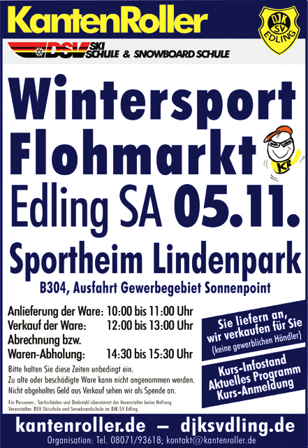 Am Samstag, 5. November, findet der beliebte Wintersport-Flohmarkt in Edling (keine gewerblichen Händler erlaubt) statt. Mit Ski, Snowboards, Schlitten, Helmen und und und …